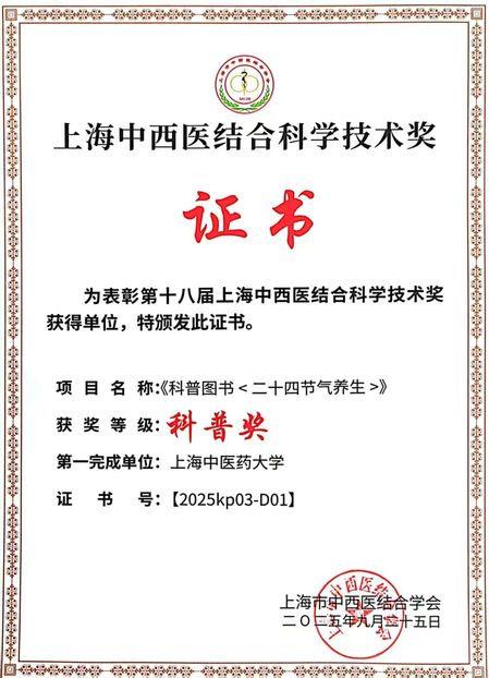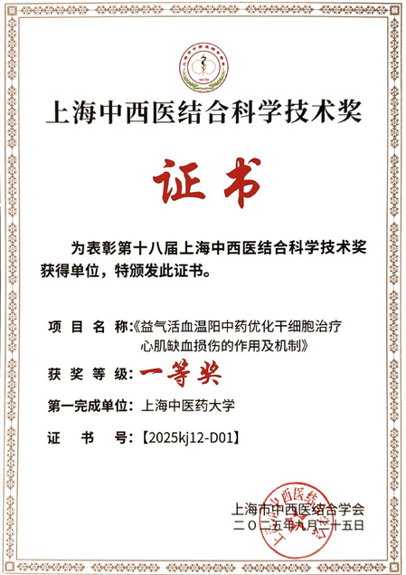 2025年9月25日,上海市中西医结合学会举行“第十八届上海中西医结合科学技术奖颁奖大会”。做爱自拍 党委副书记、常务副院长国海东研究员领衔项目《益气活血温阳中药优化干细胞治疗心肌缺血损伤的作用及机制》荣获上海中西医结合科技奖一等奖,做爱自拍党委副书记、副院长马杰主任医师领衔项目《科普图书〈二十四节气养生〉》荣获上海中西医结合科技奖科普奖。