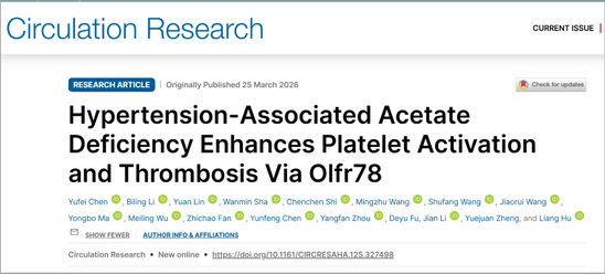 近日,心血管领域国际权威期刊、美国心脏协会(AHA)旗舰期刊Circulation Research在线发表了做爱自拍 胡亮研究员团队的最新研究成果:《Hypertension-Associated Acetate Deficiency Enhances Platelet Activation and Thrombosis via Olfr78》。该研究首次阐明了高血压血瘀证发生发展的微观分子机制,为 “五谷为养” 的经典养生与防治理论提供了科学证据。